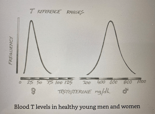 Again, there is scepticism about T in this domain. Sari van Anders, from Queen’s University, Canada, claimed that men and women’s T levels overlap and the binary is purely political. It won’t come as a shock to learn that Sari van Anders is involved in transgender activism. Ms. van Anders’ argument is contradicted by studies of T levels detected using mass spectrometry (MS), what Dr. Hooven calls the “gold standard” of T measurement. The endocrinologist David Handelsman did a meta-analysis of studies of T measured using MS and found that there was no overlap in T levels between men and women. This is shown in the book by the graph drawing below:
