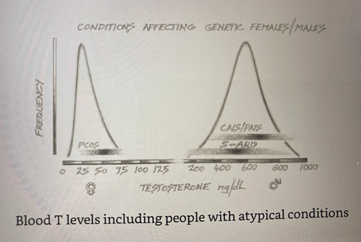 This is in contrast with height differences between the sexes where there is overlap. These studies only measured healthy men and women however. Would the distribution of T levels be different if, say, DSD conditions were included? A study by Richard Clark measured T levels including those with DSD conditions like CAH and 5-ARD which have been described previously. Conditions like CAH and polycystic ovarian syndrome (PCOS) lead to increased androgen production so will have some effect on T levels. However, even this does not cause overlap between men and women as seen below: